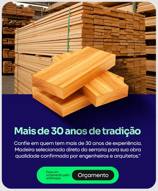 “Confie em quem tem mais de 30 anos de experiência. Madeira selecionada direto da serraria para sua obra — qualidade confirmada por engenheiros e arquitetos.”